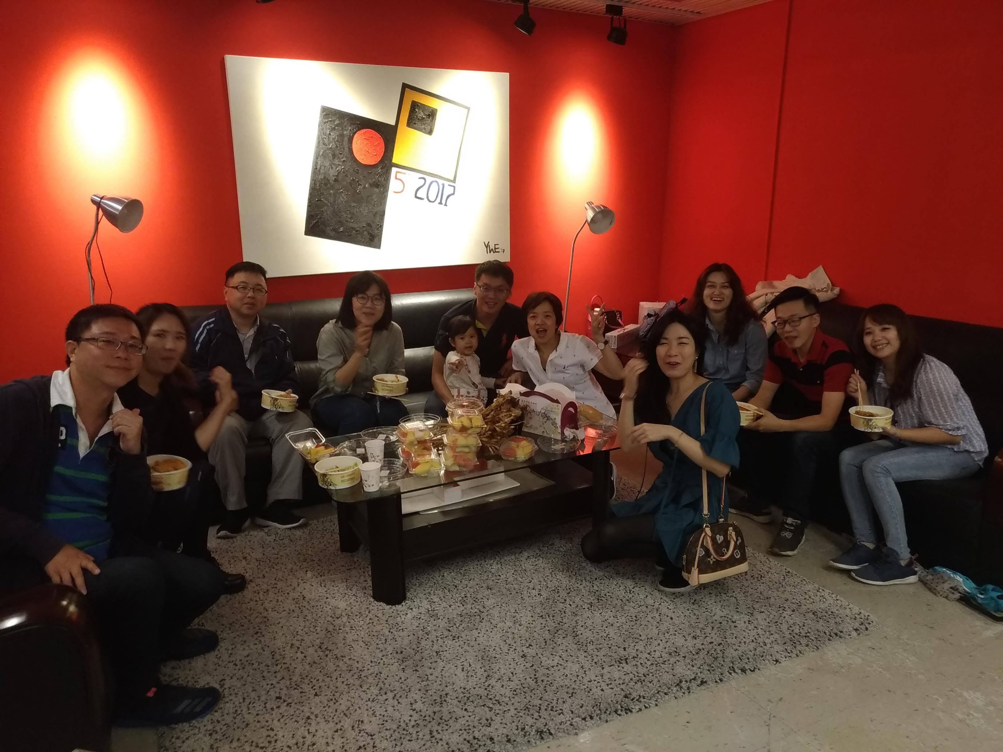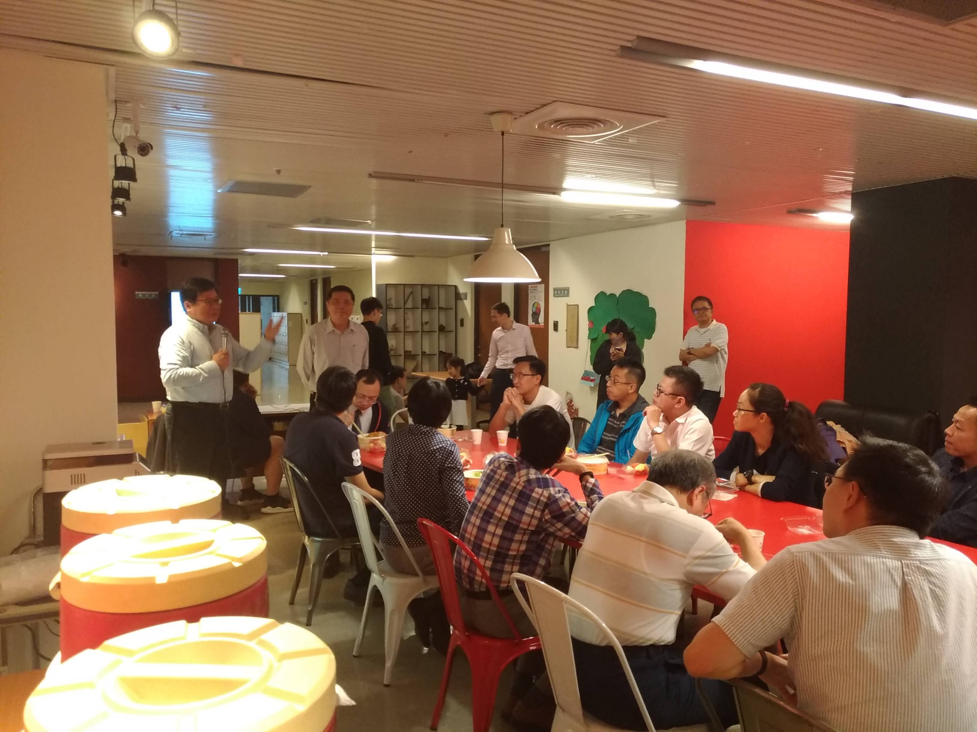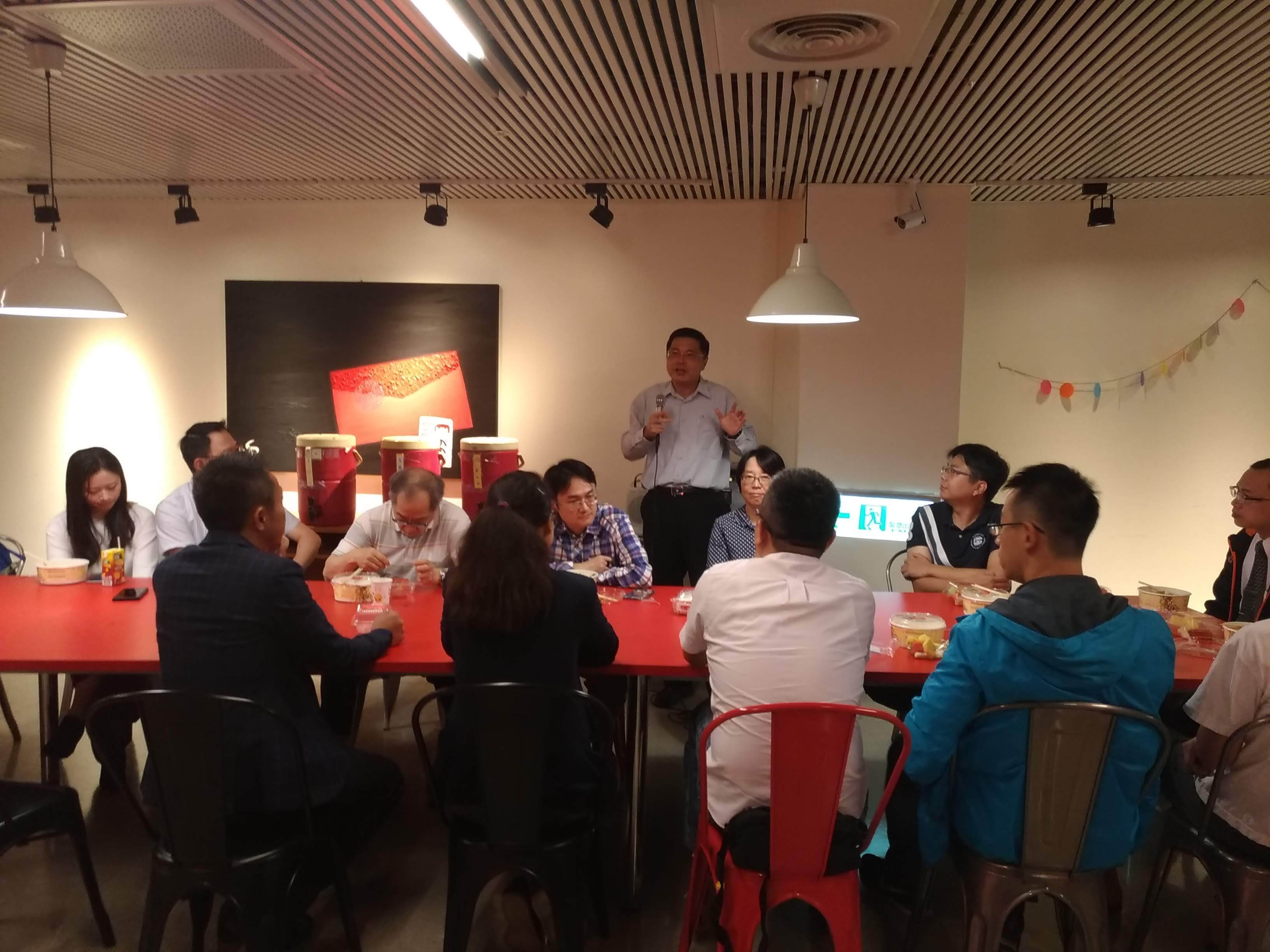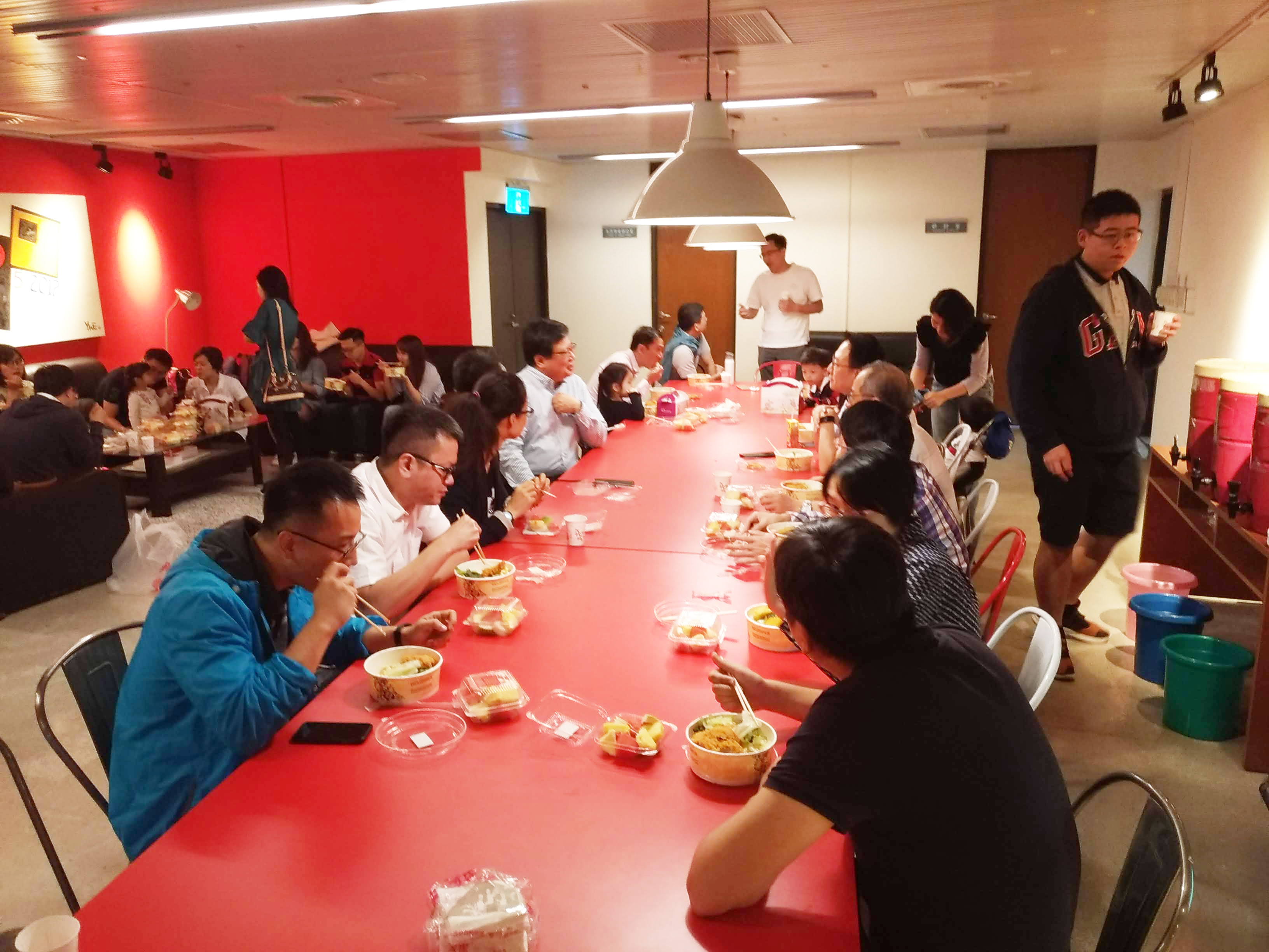 中午用餐時刻,畢業校友們於管理學院7樓大會議室前方RED TABLE區與老師、學弟妹們一同用餐,老師與校友們聊起當年學生時代的點點滴滴,大家有說有笑,共度美好的時光。