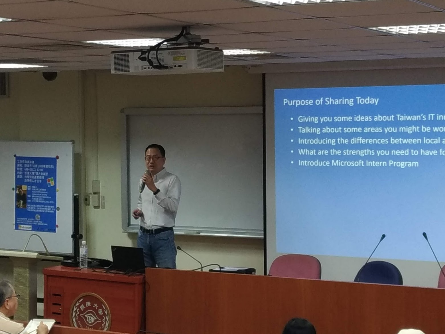 由於學長在美國微軟任職,順便介紹台灣微軟一年一次的實習「未來生涯體驗計劃」,不限學校、不分科系、不看成績,不論社團經歷,每年提供為期一年,超過 25 個部門、近百個實習名額,讓年輕人在踏入職場前,搶先體驗與磨練。能爭取到這實習機會,會是未來找工作很好的亮點,希望學弟妹多多把握。