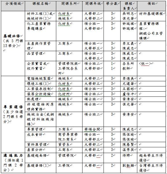 註一:學生於原所屬系所選課,修課時間(學期)依原系所規定辦理。本課程須至企業實習至少(含)8週,實習單位由學程召集人指定或事前核可。民國104年暑假完成企業實習或校外實習者,實習單位不受此限制